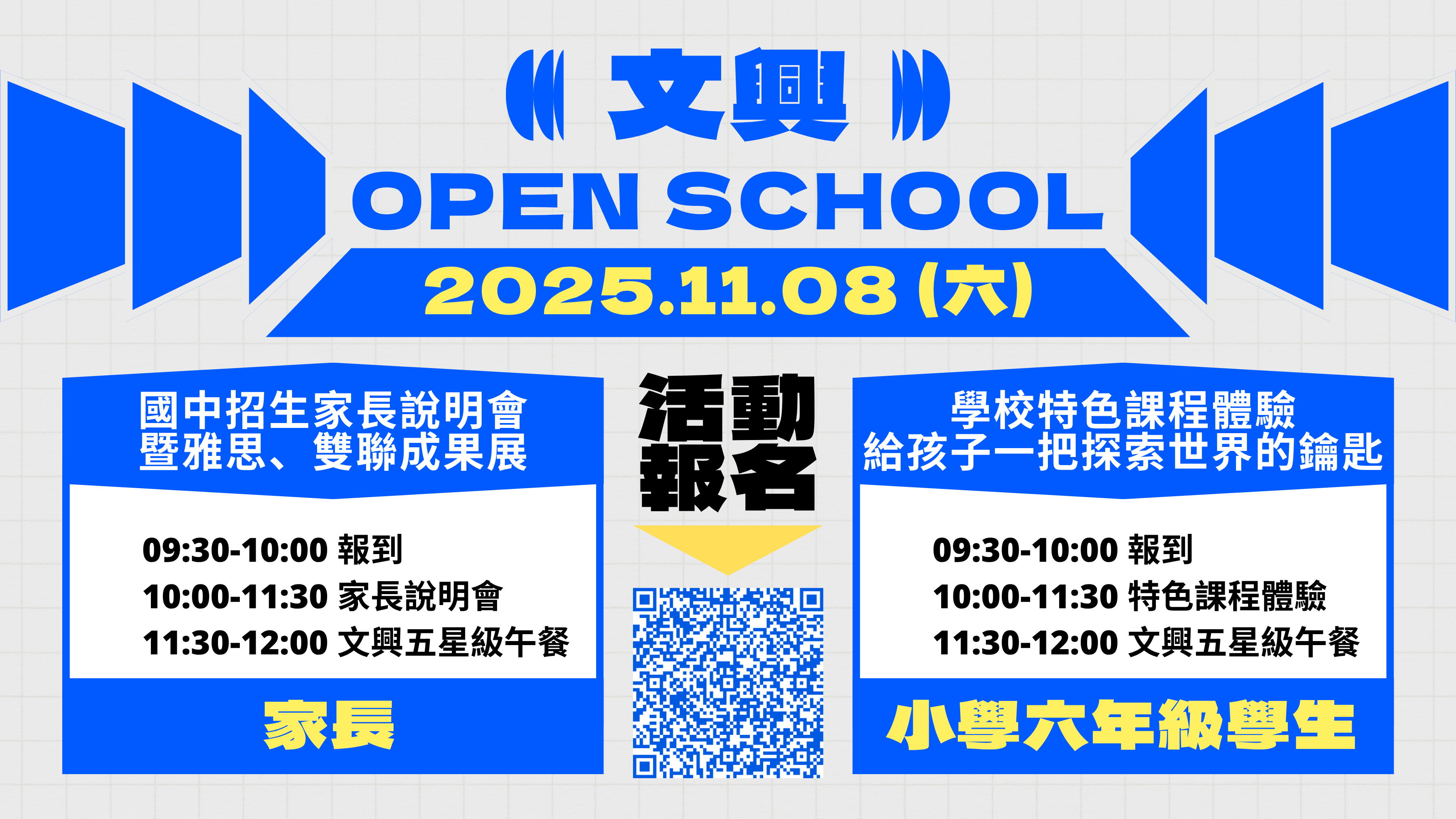 為使社區家長了解本校基督為本的核心教育理念,並讓社區學生認識天主教學校,特於114年11月8日(六)上午文興OPEN SCHOOL DAY辦理學生闖關遊戲及家長說明會,活動說明(如附件三)。 |